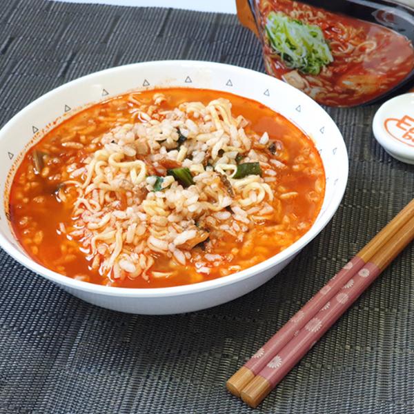 - めん(小麦粉、植物油、食塩、異性化液糖、しょう油、デキストリン)、アルファ米、かやく(大豆たんぱく、キムチ、キャベツ、チンゲンサイ、にんじん、わかめ) 、スープ(野菜(にんにく、たまねぎ、ねぎ)、食塩、牛肉粉末スープ、砂糖、しょう油、ブドウ糖、デキストリン、牛脂、香辛料、いか、水飴、貝調味料、カキエキス、植物油、牛肉風味エキス)